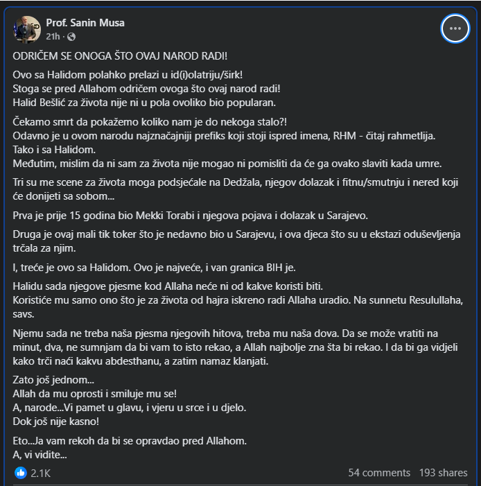 Osnivač pokreta „VJERA. NAROD. DRŽAVA.“ i predsjednik Bosanske narodne stranke, Sanin Musa, oglasio se na društvenim mrežama povodom brojnih reakcija građana nakon smrti legendarnog pjevača Halida Bešlića.